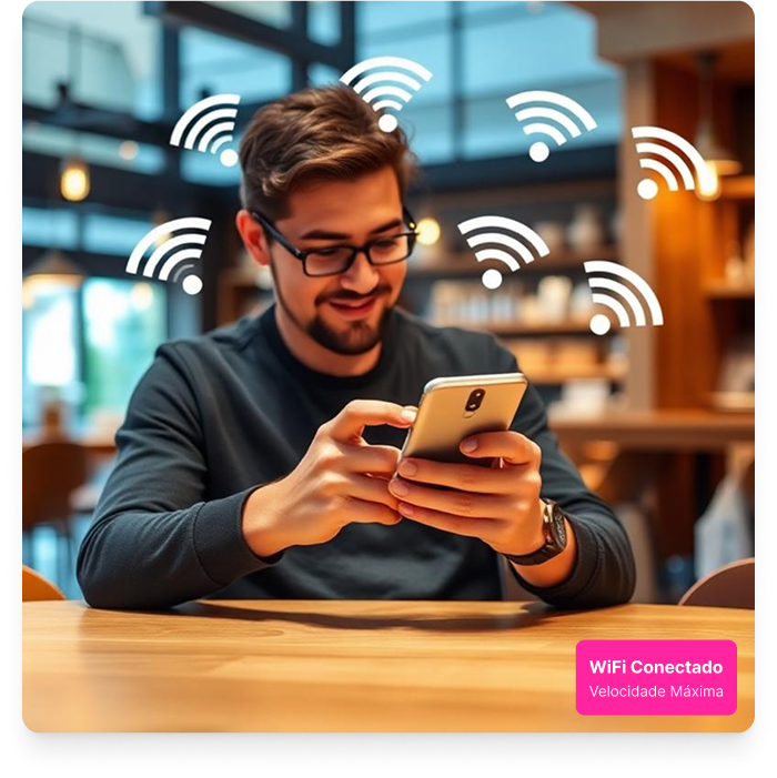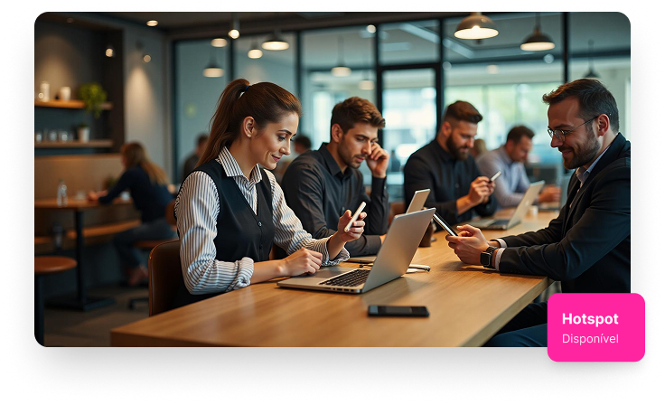 Internet garantida e segura para seu negócio, com gestão completa de acessos Wi-Fi. Melhore a experiência dos seus clientes sem custo adicional.